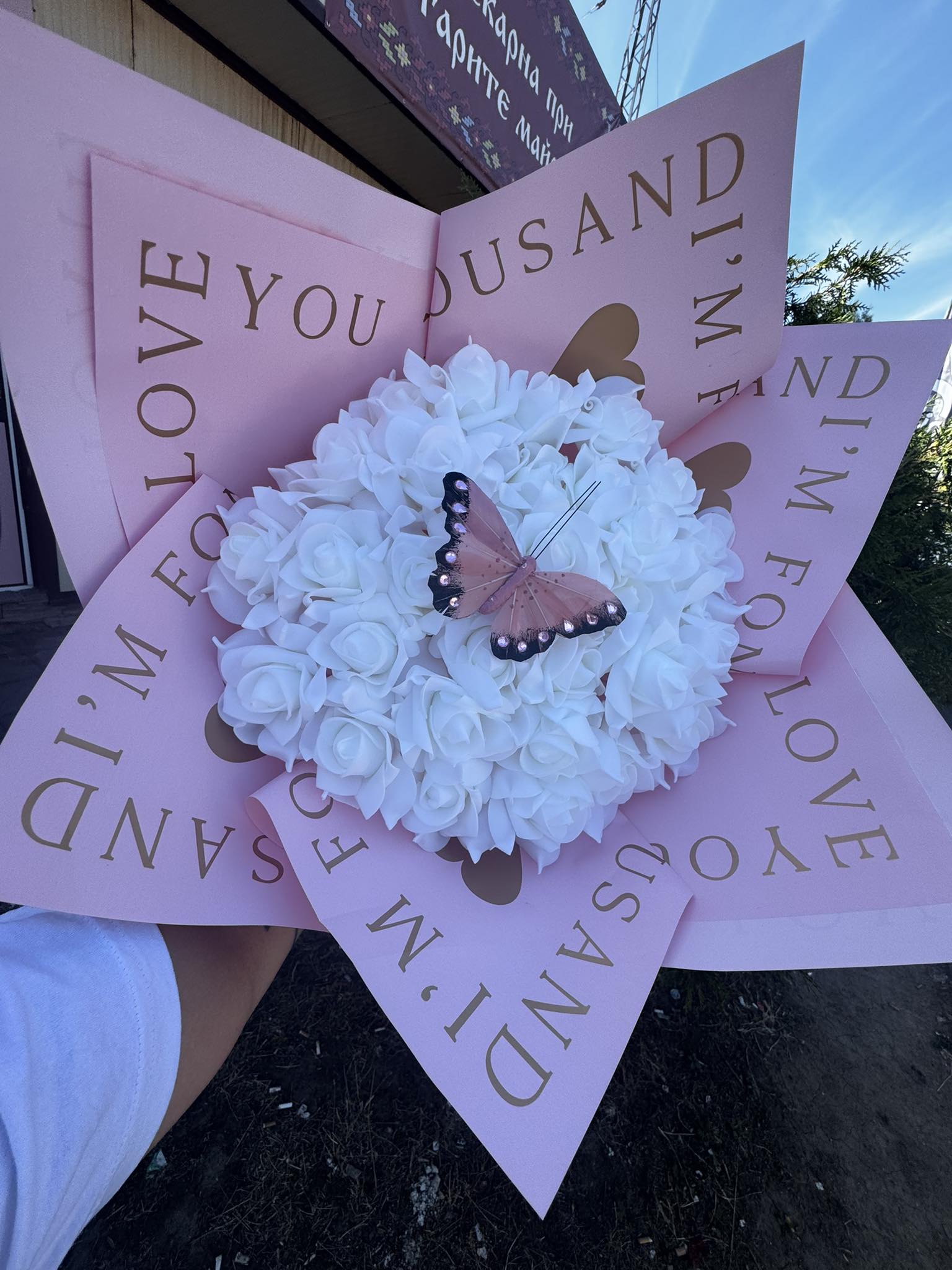 Екзотика и елегантност в едно! Този изискан букет е изграден от ръчно аранжирани фламени рози в снежнобяло, поднесени в стилна розова опаковка с луксозно златно послание “I’m for you, thousand love”. Нежната декоративна пеперуда добавя фин завършек и символика за ново начало и красота.