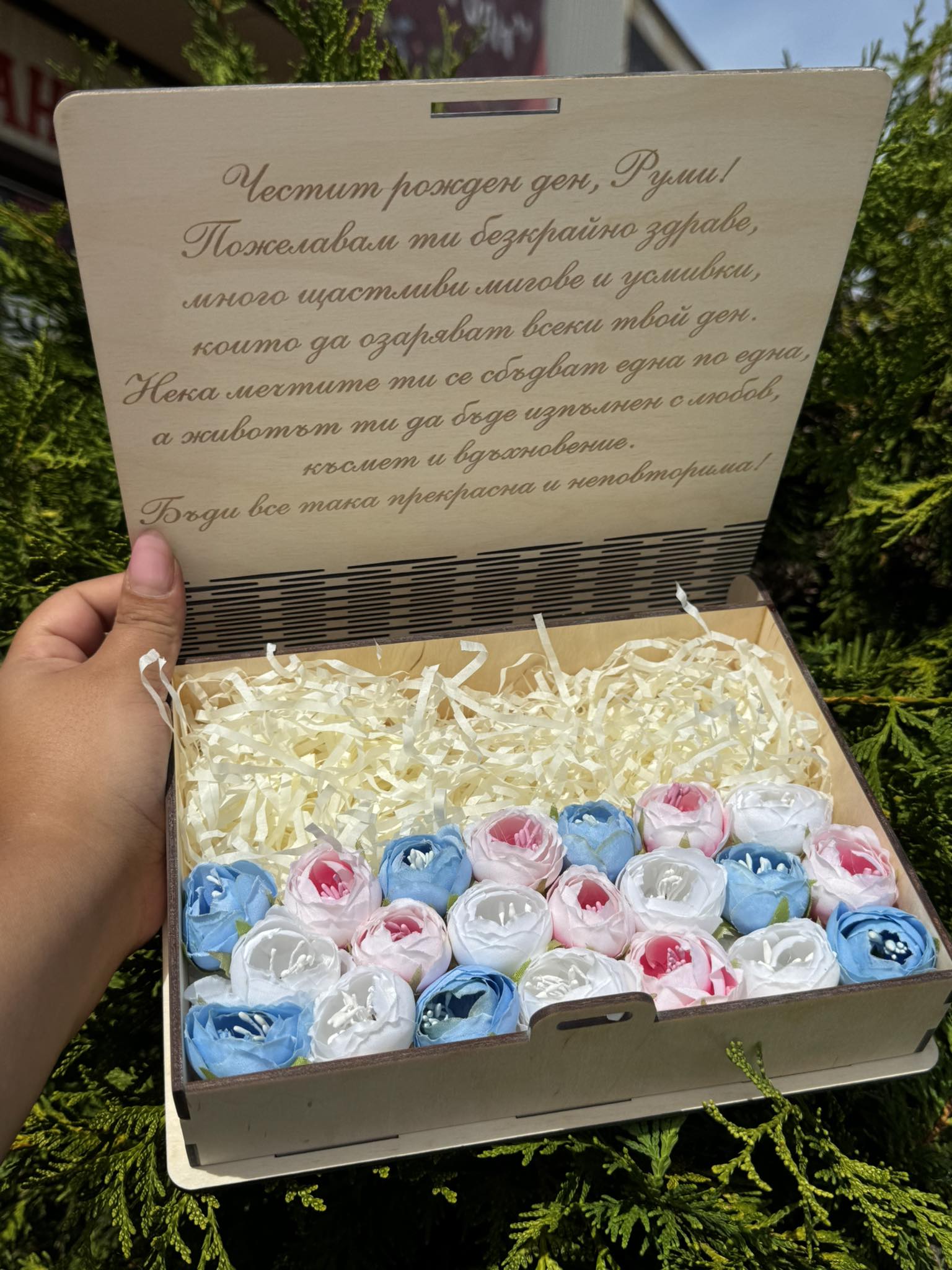 Тази елегантна дървена кутия е персонализирана с красиво гравирано пожелание и е изпълнена с нежни цветя в бяло, синьо и розово. Перфектен избор за рожден ден, юбилей или специален повод – подарък, който съчетава стил и сантиментална стойност.