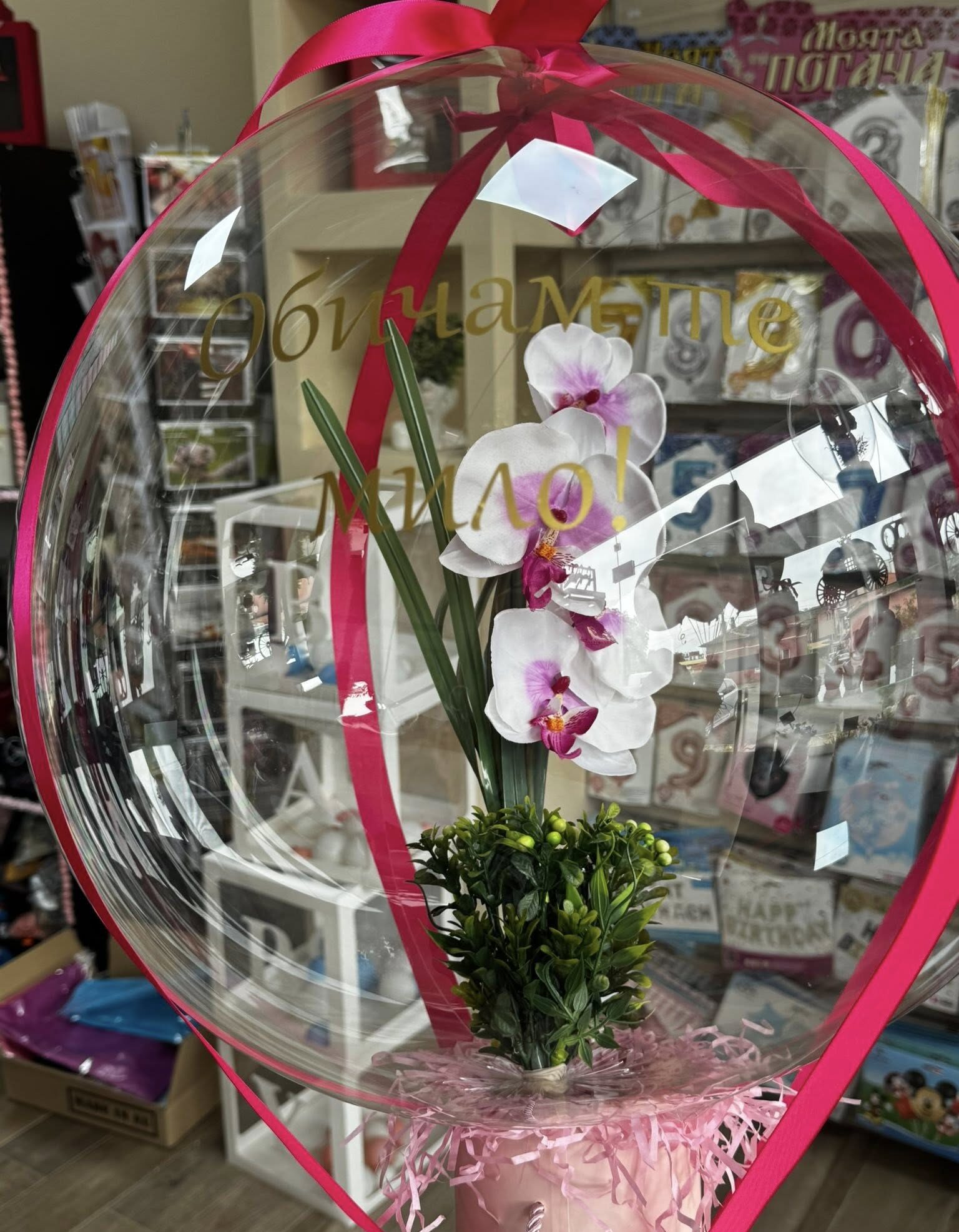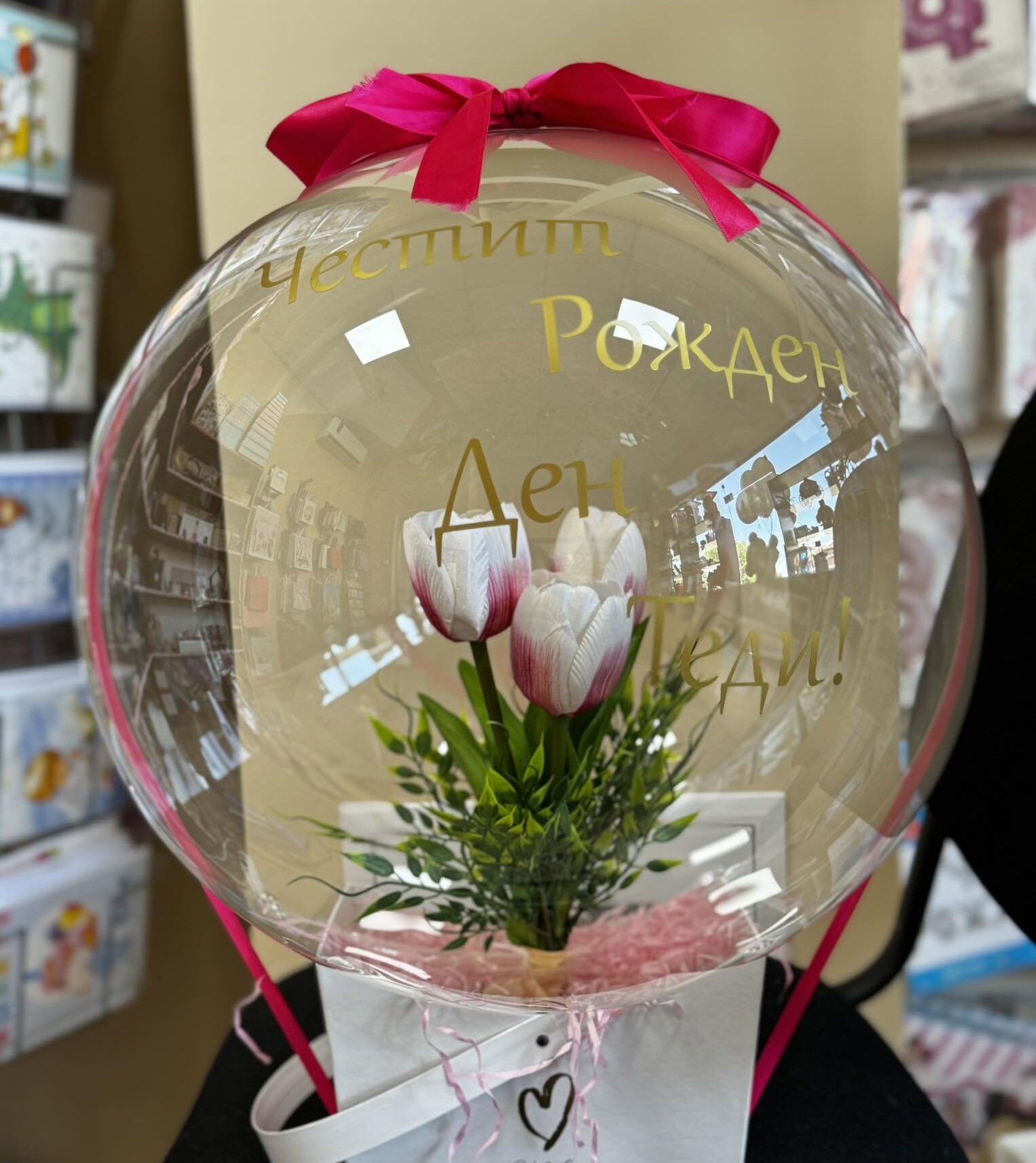 Уникален и стилен подарък, който впечатлява от пръв поглед! Прозрачният кристален балон е изпълнен с ръчно подбрани сапунени или естествени цветя по твой избор, а отвън може да бъде украсен с панделка или персонализиран надпис. Подходящ е за рожден ден, годишнина, сватба или специален повод, когато искаш да изненадаш любим човек по незабравим начин.