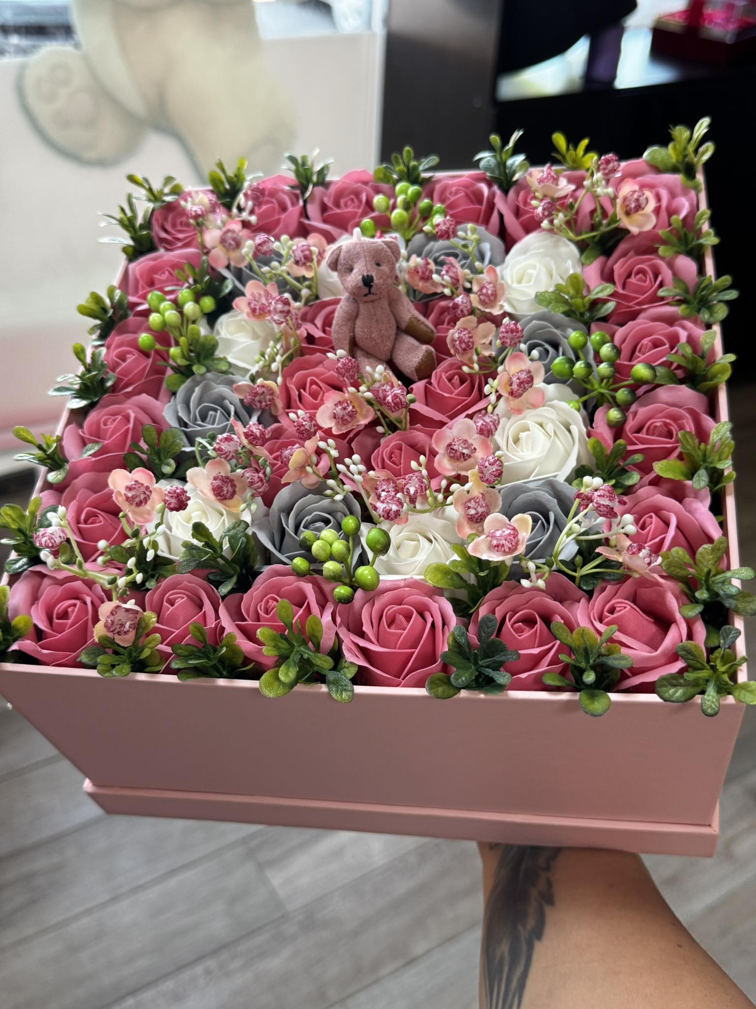 Подари нежност и усмивка с тази изискана кутия, изпълнена с ръчно подредени сапунени рози в розово, бяло и сиво, допълнени от декоративна зеленина и нежни акценти. В центъра ѝ е поставено сладко плюшено мече – символ на обич и топлина.